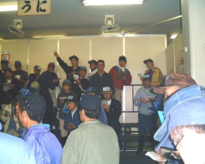 THIS IS WHERE THE BIDDING ON THE SEA URCHIN ROW TAKE PLACE. I JUMPED UP IN THE SMALL GRAND STAND FOR A PHOTO WHILE THE BIDDING WAS TAKING PLACE.